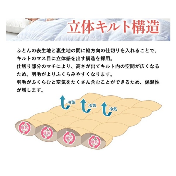 厳選された羽毛を1.2kg使用した軽くて暖かい羽毛布団です