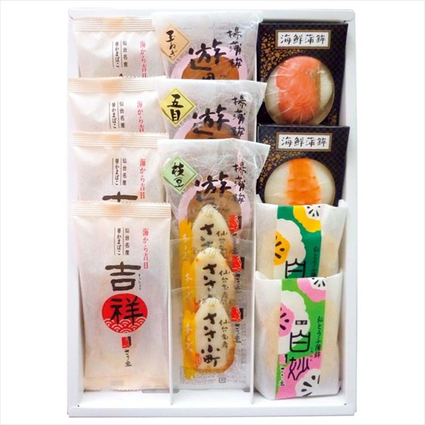 ●内容量:笹かまぼこ35g×4、真空笹かまぼこ(チーズ)20g×3、揚げ蒲鉾(枝豆・五目・玉ねぎ)各40g、おとうふ蒲鉾(柚子・プレーン)各50g、海鮮蒲鉾(えび・紅鮭)各50g