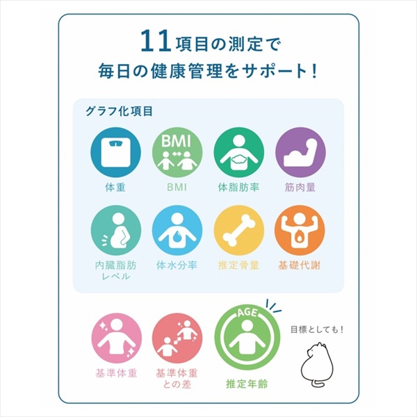 ●測定項目:体重/BMI/体脂肪率/筋肉量/内臓脂肪レベル/体水分率/推定骨量/基礎代謝/基準体重/基準体重との差/推定年齢