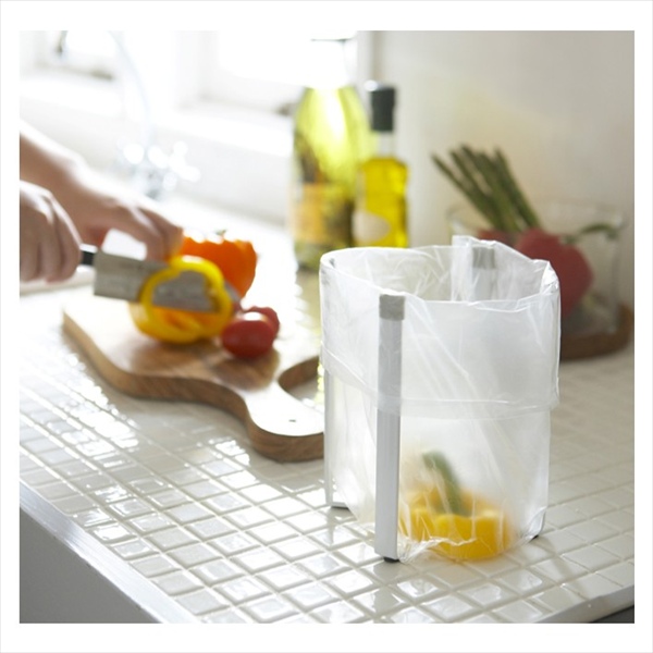 ポリ袋を掛けて調理中にでる野菜クズや資源ゴミを、その場でポイ!