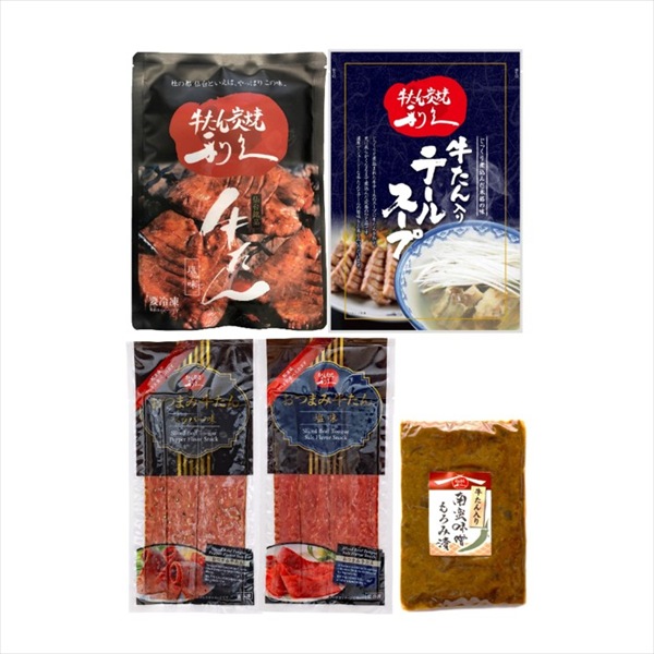 ●内容量:牛たんしお味 100g×1、おつまみ牛たん(しお味50g・ペッパー味50g)×各1、テールスープ250g×1、牛たん入り南蛮味噌もろみ漬100g×1