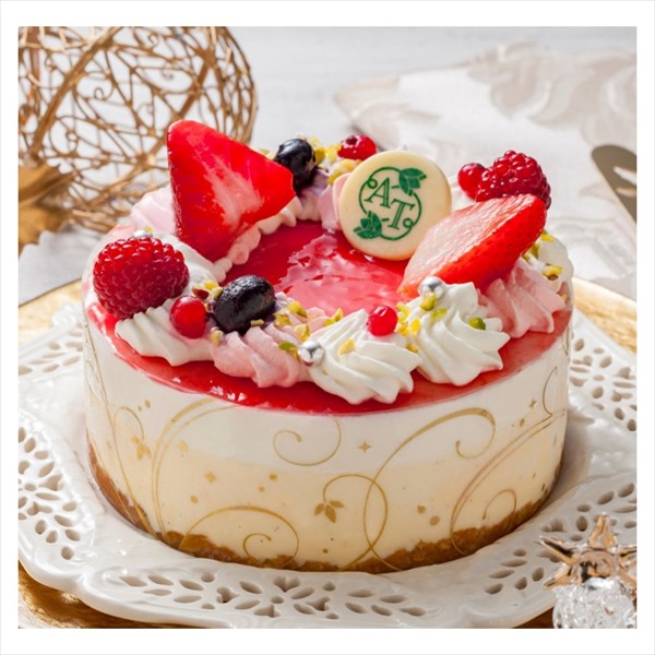 木苺のソースに4種のベリーとクリームをトッピングした華やかなアイスケーキ